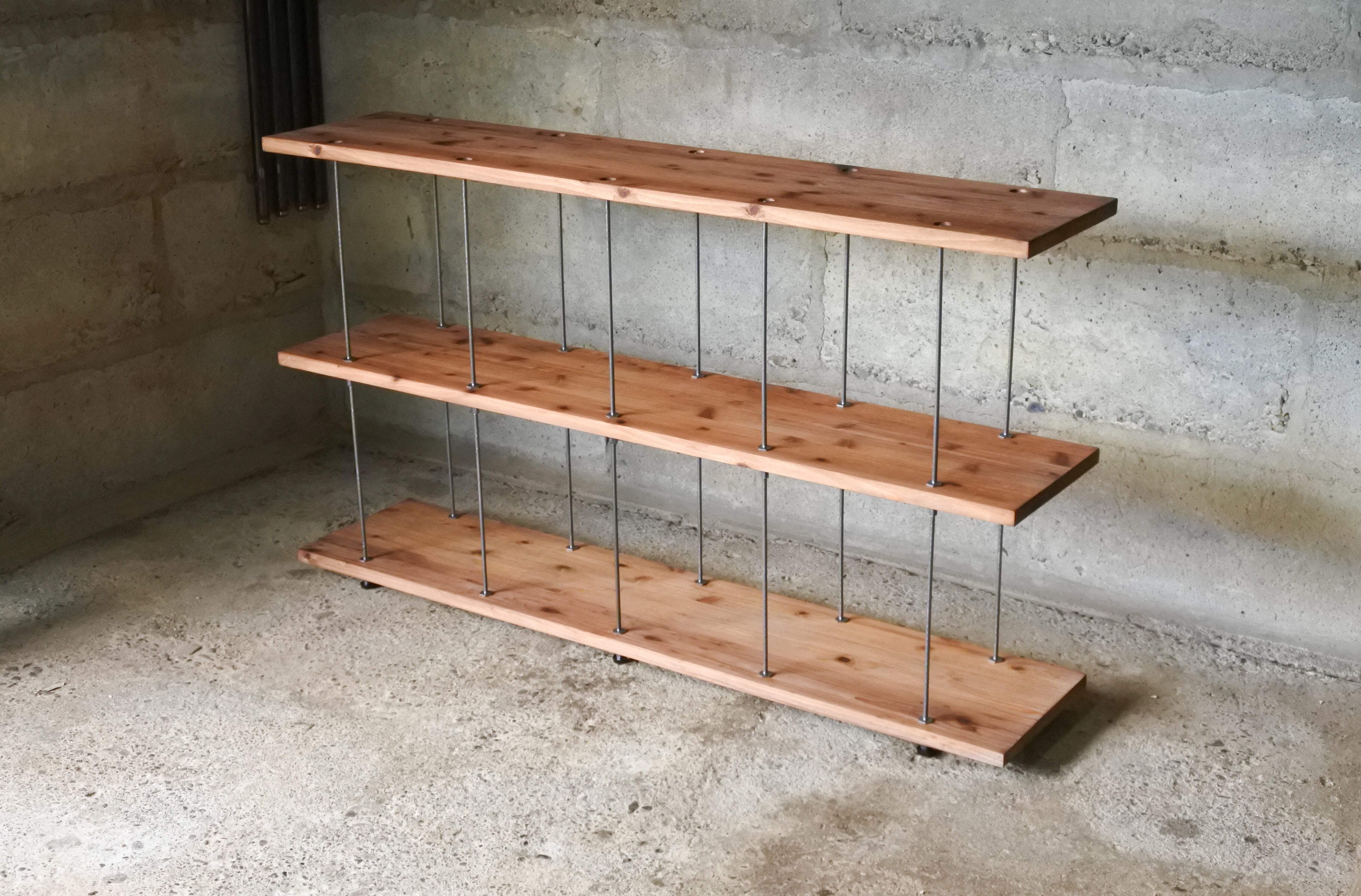 杉の接ぎ板ででつくったシェルフです。厚み24㎜の丈夫な材で組んでいるのでブックシェルフなどとしてもいかがでしょうか。中だるみ防止にアジャスターを6本使用しております。